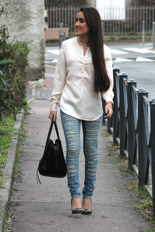 Aujourd'hui je vous propose un look "travail chic' sans etre trop serieux. J'ai joué l'effet de contraste avec un haut plutot "rangé" et un jean dechiré et travaillé..